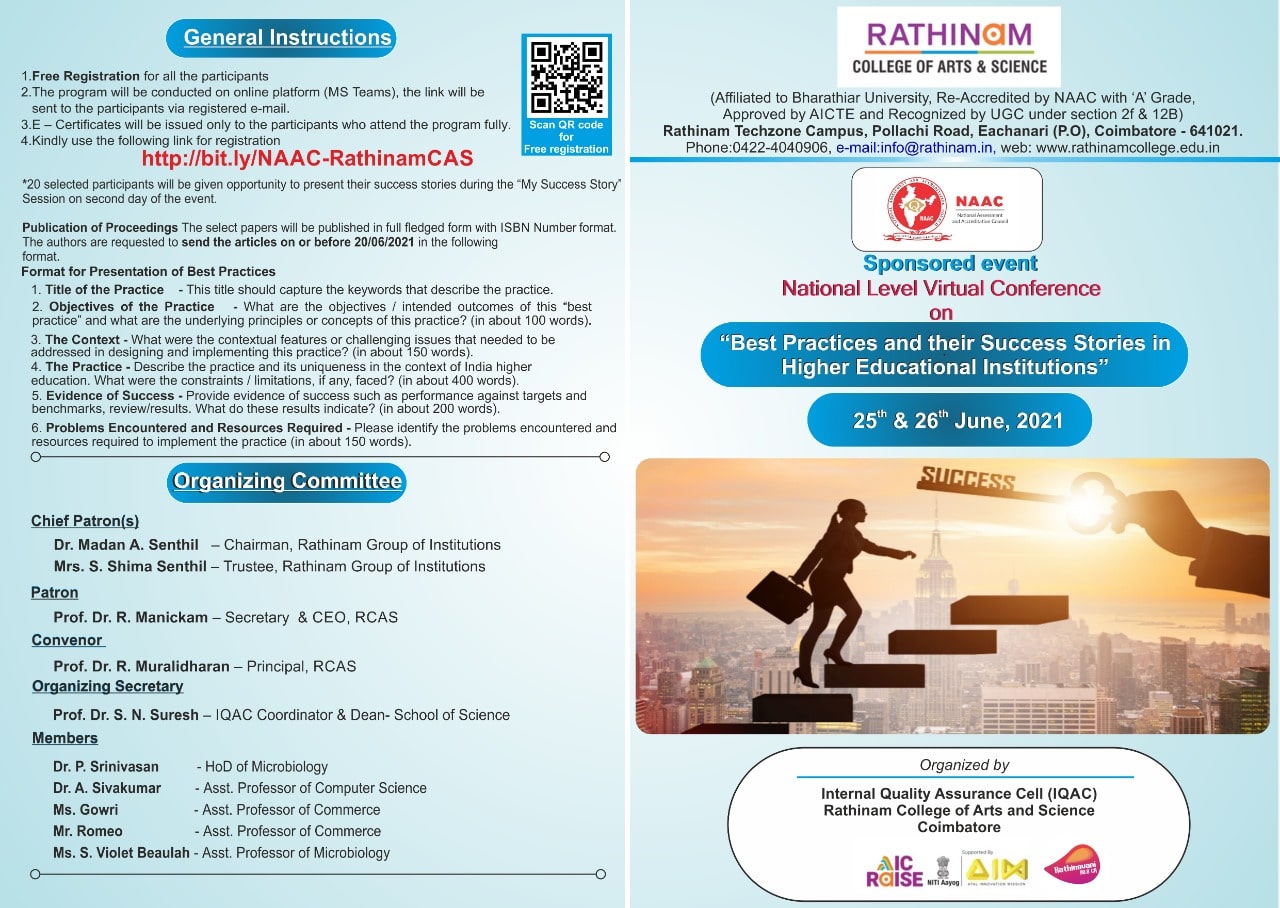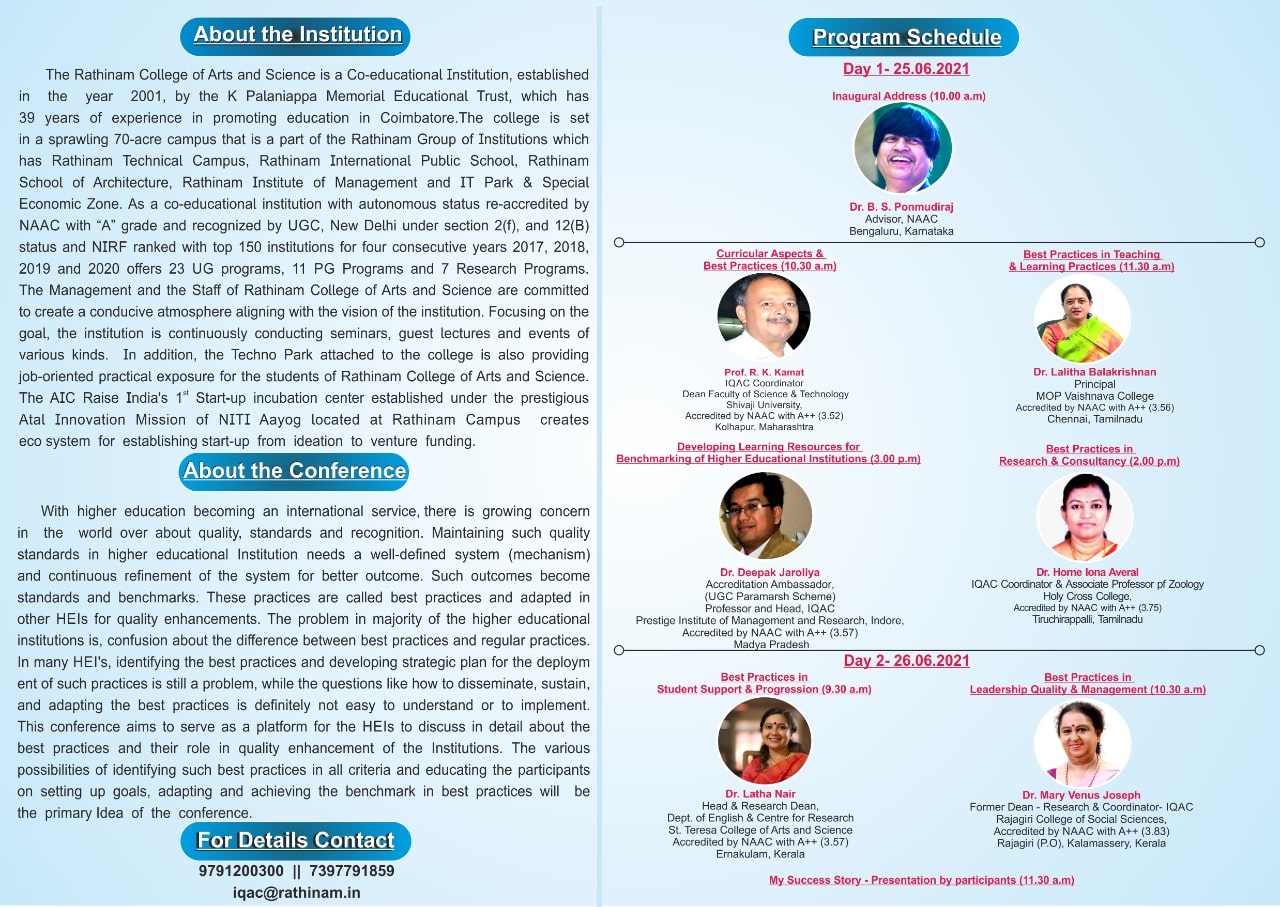 The Internal Quality Assurance Cell (IQAC) is organizing NAAC Sponsored two days Virtual National Conference ““Best Practices and their success stories in Higher Educational Institutions” on 25th & 26th June, 2021. The registration for the program is free. E-certificates will be issued to all the participants. The brochure and registration form are enclosed. Kindly forward to your friends and colleagues.